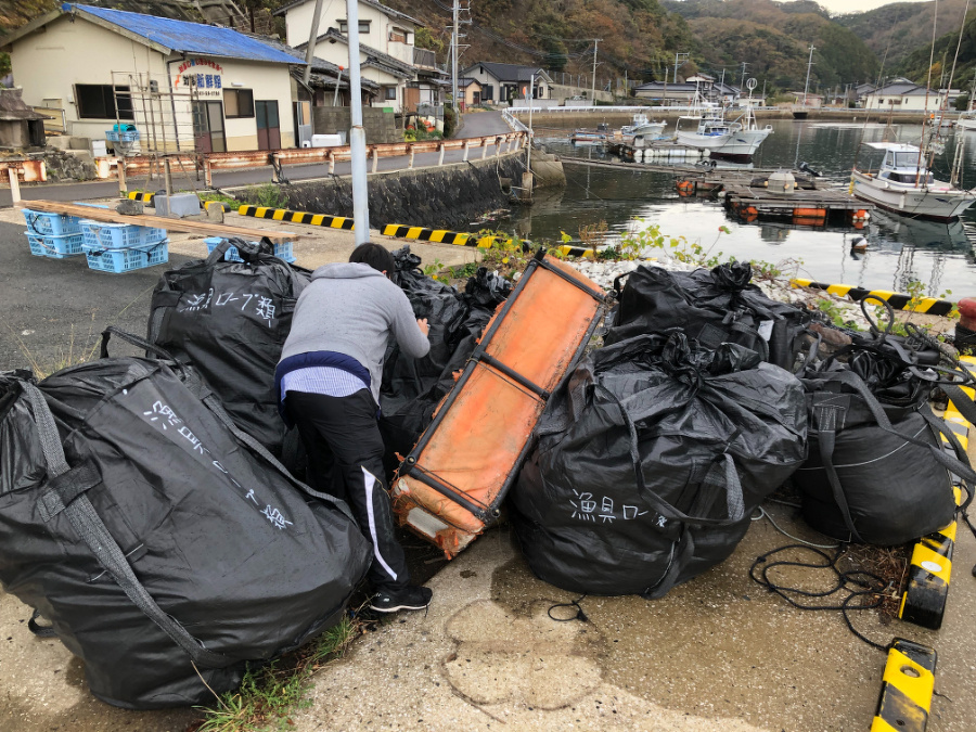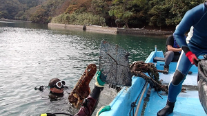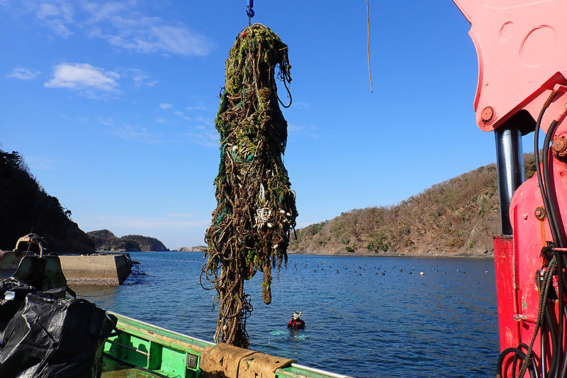 その過程で、沈んだ漁網やロープ類がサンゴを傷つける深刻な状況を確認。2018年から回収を開始し、これまでにクレーンなどを使いフレコンバックで27袋分のごみを撤去しました。