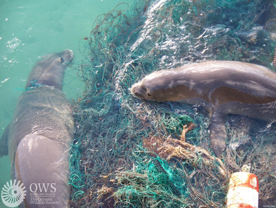 漁網に絡まったアザラシ(米国北西ハワイ諸島/写真提供:FWSジョン・クラビッター)