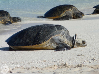 プラスチックの輪っかが首にはまったアオウミガメ(米国北西ハワイ諸島/写真提供:NMFSマーク・サリバン)