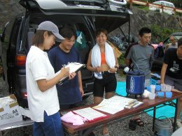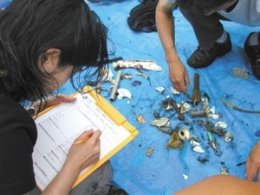 回収したごみはシート上で分類。各グループごとにデータカードに記録します。