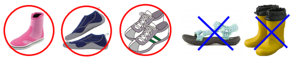 - ●歩きやすい運動靴やスニーカーでお越しください。歩きにくく、ケガをしやすいので、ビーチサンダル、クロックス等(脱げやすいもの/素足が出るもの)での参加は不可とします。(観察時には持参した海用のシューズに履き替え)