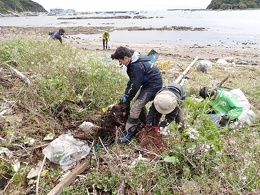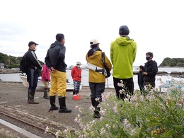 4月16日(土)、ハマダイコンが咲き乱れる春の江奈湾東干潟で観察会とごみ回収を実施しました。
