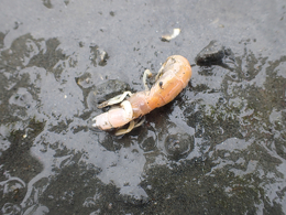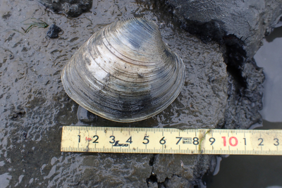 予報は雨と強風とのことで雨天装備で臨みましたが、天候は好転し、快適に調査を進めることができ、76種を超える干潟ベントス種を確認しました。