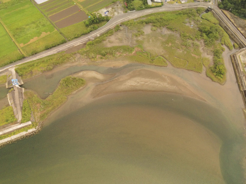 前日11日のゆかし潟調査は曇り時々豪雨というあいにくの天気でしたが、太田川調査は好天に恵まれ、地元中学の角友子先生、東邦光先生も参加いただき、9名での調査となりました。また、調査の様子なども田原先生によってドローン撮影されました。