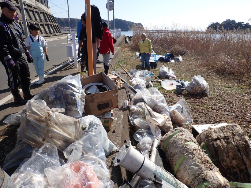 西干潟での活動は久しぶりだったこともあり、枯れたヨシと雑草刈りを19日に済ませて当日に臨みました。今回も残念ながら県道からの投棄ごみが多く、1時間半ほどの活動で252㎏のごみを回収しました。投棄ごみには、悪質な事業者によるものと思われる廃棄人工芝も含まれ、参加者の小学生に説明がはばかられるものでした。