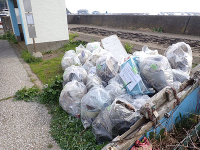 砂浜の漂着ごみは多くなかったのですが、堤防下の雑草の中にはたくさんのごみが溜まっていて、1時間足らずの回収で145㎏のごみを回収しました。