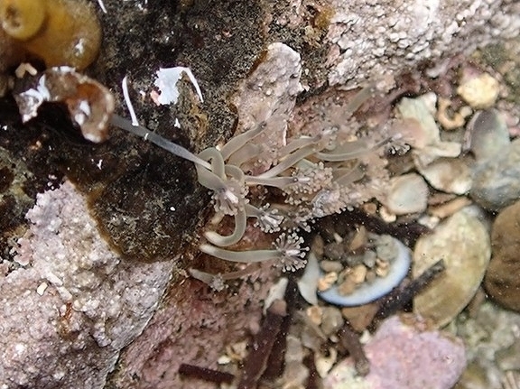 磯の観察では春の訪れを告げるカラマツガイの産卵がたくさん見られたほか、初記録のオオタマウミヒドラ(Hydrocoryne miurensis) のポリプがあちこちで観察できました。このポリプの根元から1~2mmくらいの小さなクラゲが出芽するんだそう。