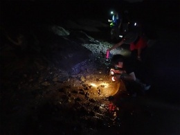 この日はまだシーズン初期のためでしょうか、なかなか放仔が始まりませんでしたが、それでも周囲が真っ暗になると、海岸沿いの森の中からアカテガニやベンケイガニなどが次々に現れて海に入り、お腹に抱えた幼生を海に放って行きました。