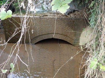 上流の裸地が影響しているようですが、県道を横断する暗渠(水路)はほとんど土砂でつまった状態となっており、澪筋は、短い長靴で歩けるほど土砂で埋まっていました。