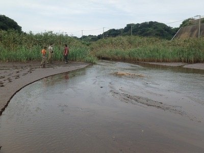 干潟面には流入した畑土が堆積し、湾全体の水も茶色く濁ったままで、いつもと違う干潟の様子に驚きました。
