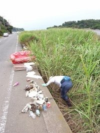 国道を通る車に気をつけながら、葦原内のゴミを回収していきます。