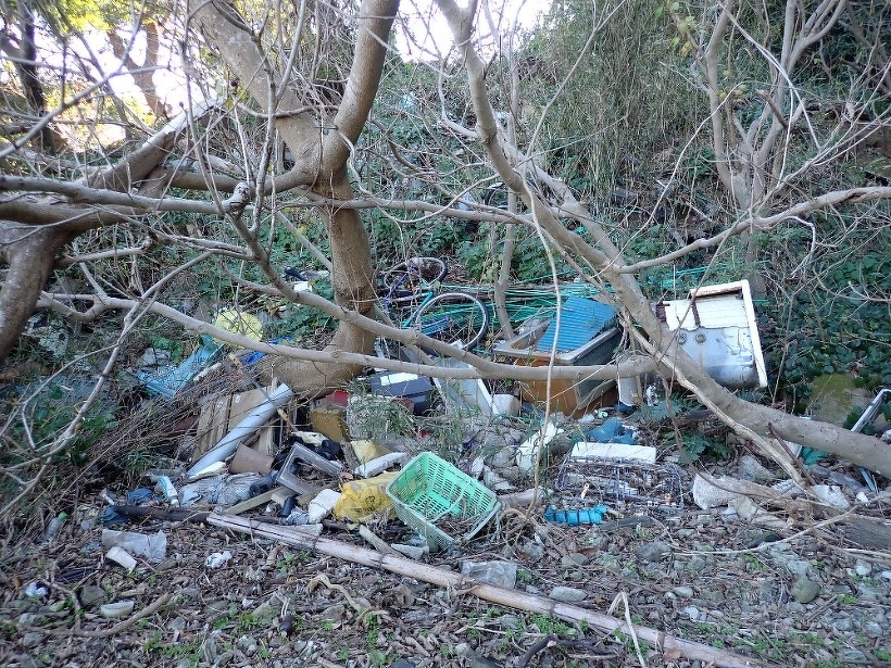 1月22日、江奈湾での干潟観察会とごみ回収活動を行いましたが、その際、毘沙門地区の大量投棄ごみの現場視察を行いました。