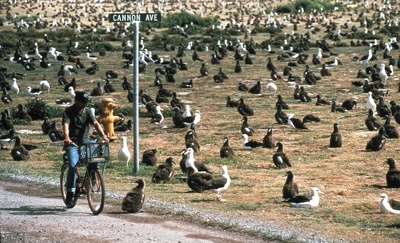 ミッドウェイ環礁は、コアホウドリの世界最大(総数の70%)の繁殖地です。これは世界中のどの鳥の集団よりも大きく、2番目に大きな繁殖群集をつくるのは、クロアシ・アホウドリで(31%)おなじくミッドウェイ環礁に巣をつくります。1800年代後期から1930年代の間は、羽毛と卵の密猟者がミッドウェイを訪れましたが、その個体数にそれほど深刻な影響はありませんでした。その時代はイースタン島、サンド島両方の飛行場を含む軍の基地、建物の建設が繁殖場である土地を侵略し、そしてたくさんの兵士、軍関係者が島に住んだことにより、第2次世界大戦の終結する1945年夏までアホウドリの生活に大きな影響を及ぼしました。しかし、それらの妨げがあったにもかかわらず、ミッドウェイ環礁が太平洋上のレーダー搭載飛行機の基地になるまでの10年間、アホウドリは順調に繁殖を続けました。この新しい軍事行為はサンド島に生息するアホウドリの群集にとって、1965年の春まで影響のあるもので、軍事通信に必要な高層アンテナが1950年半ばから60年にかけてイースタン島とサンド島に設置されました。その間、何千羽というアホウドリを殺した高層アンテナは、1967年にイースタン島から撤去され、サンド島からは1991年と92年に撤去されました。ミッドウェイ環礁での軍事行為は1978年の海軍航空施設への縮小以来、少しずつ減少され、それによりアホウドリの数は増えだしました。