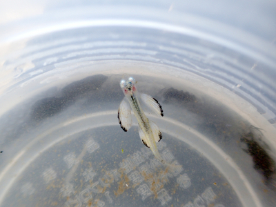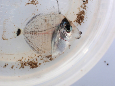 潮溜まりでは、珍しい稚魚を2種みつけてくれました。透明な身体のニザダイの仲間の幼魚とトビウオの稚魚のようでした。