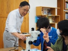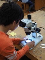 最初にオリンパスさんから顕微鏡の使い方についてご指導いただき、スタッフが午前中にお台場海浜公園で採集してきたプランクトンやゴカイを皆で観察しました。お台場の海は赤潮が発生していたので、いろいろな種類のプランクトンが観察できました。