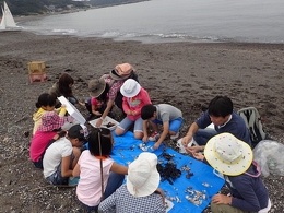 午前中は砂浜海岸で漂着物調べ。貝殻やウニの殻、海藻など子ども達が海岸で見つけてきたものを解説しました。