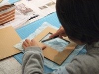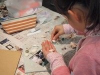 台紙に好きな色の表装紙を貼ってから、海岸で集めてきた貝殻や流木、砂などをレイアウトして貼りつけていきます。