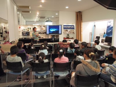 子ども達はキレイな海の生き物たちの写真に興味津々。