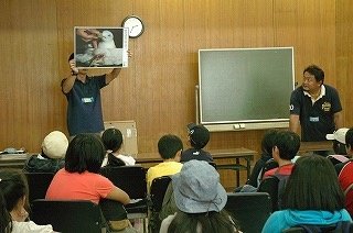 野生生物たちが受けている被害について写真パネルを見て学びました。