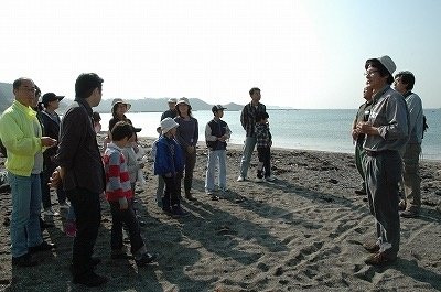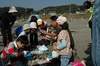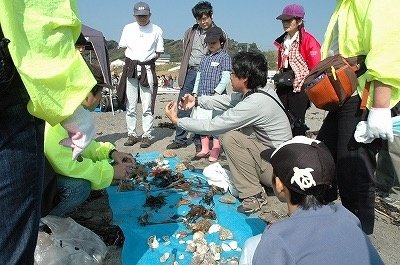 砂浜の漂着物や生きものをグループごとに集め、グループリーダーが解説しました。
