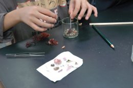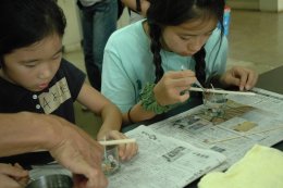 小さな貝やキレイな海藻などの材料を海岸で拾い集め、