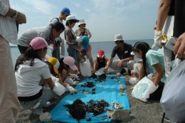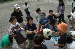 グループごとに、砂浜の生きもの、流れ着いたものを調べて、グループリーダーが解説しました。
