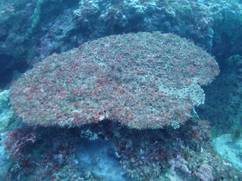Cコドラートのエンタクミドリイシは昨年白化後、一部を残して斃死しましたが、形状はそのまま残っており藻類に覆われていました。