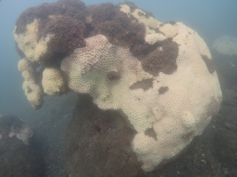 今回は台風21号の影響による強いうねりと濁りの中での調査となりました。水中の様子は心配していたとおり、8月上旬から9月下旬まで続いた高水温によるとみられる白化群体が目立ちました。10月10日に調査した田子を上回るほどで、被害の深刻さがうかがえます。