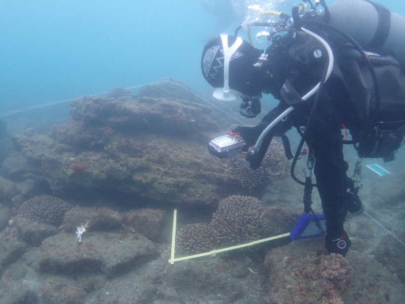 各コドラートおよび調査区周辺ではエンタクミドリイシ類の新規加入や着生が多く見られました。魚類調査は、いつも魚種の多さが際立っている沖ノ島ですが、今回は水温が15℃。さすがに魚が少なく寂しい感じでした。