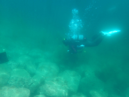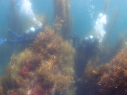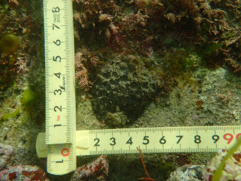 翌21日は、天候に恵まれ、周辺海域での分布状況を確認するため、長距離に渡る水中探索を行いましたが、想定通りではありましたが繁茂する海藻で視界が遮られ、限られた範囲での調査となりました。それでも2群体を確認することができました。