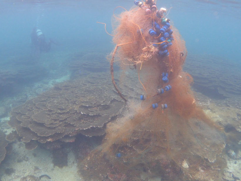 刺し網と思われるゴーストギア(逸失漁網)がクシハダミドリイシの群体に絡まっていました。最近、残念なことにこうした事態が頻繁に目撃されます。