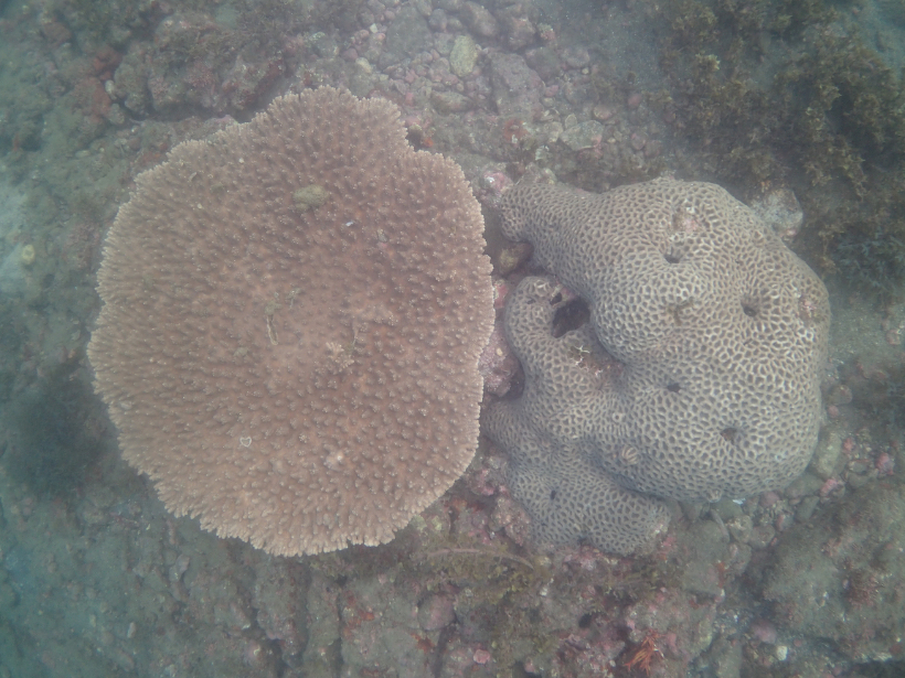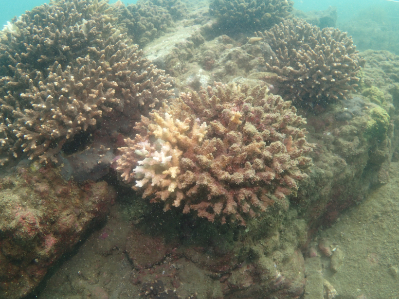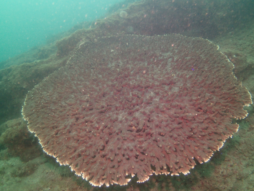 水中の透明度は外から見るより濁度が高く、あまりよくありませんでした。サンゴ群集は、ごく一部に白化斃死群体はありましたが、概ね順調に成長していました。