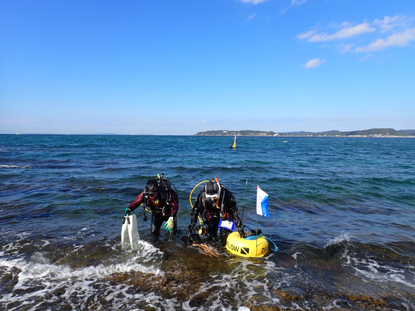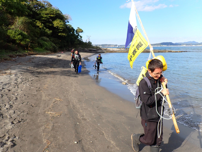 沖ノ島調査は、いつもお茶の水女子大学・湾岸生物教育研究所の協力により、大学の調査船を出していただいて実施していますが、今回はボートの船底補修のため、初めてのビーチエントリーによる実施となりました。