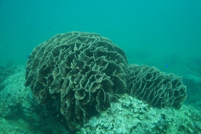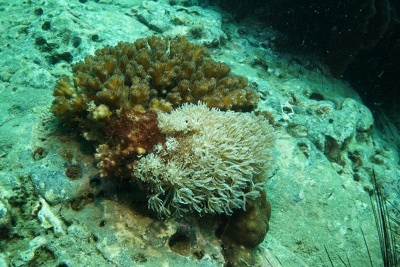 ハナヤサイサンゴの死んだ骨格上に着底したウミアザミの仲間